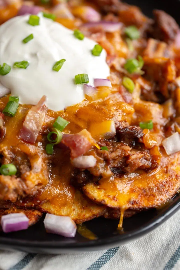 - Top with the remaining potato slices, the prepared pulled pork and sprinkle the remaining cheese and red onion on top.