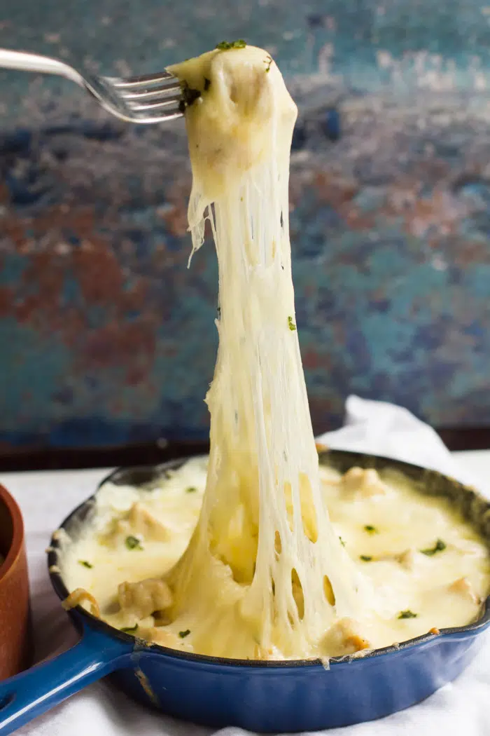 - In a 1.5 qt casserole, 8″ cast iron skillet or other oven-safe dish, combine the cheese and chicken.